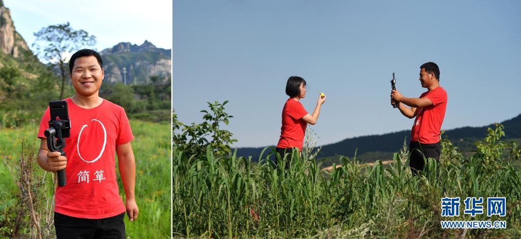 拼版照片:左圖為劉瑞旭拿著手機穩(wěn)定器;右圖為在山西省黎城縣巖井村,劉瑞旭(右)和合作社同事在谷子地里直播(7月8日攝)。今年29歲的劉瑞旭開過飯店、賣過房子、種過果樹,2019年回到老家平順縣榔樹園村做起了職業(yè)農(nóng)民,成為太行山上的“新農(nóng)人”?;卮搴?,劉瑞旭和合作社的同事抓住網(wǎng)絡(luò)直播帶貨的熱潮,嘗試田間地頭直播。借助網(wǎng)絡(luò)的力量,合作社的小米搭上了“互聯(lián)網(wǎng)+”快車銷往全國各地。