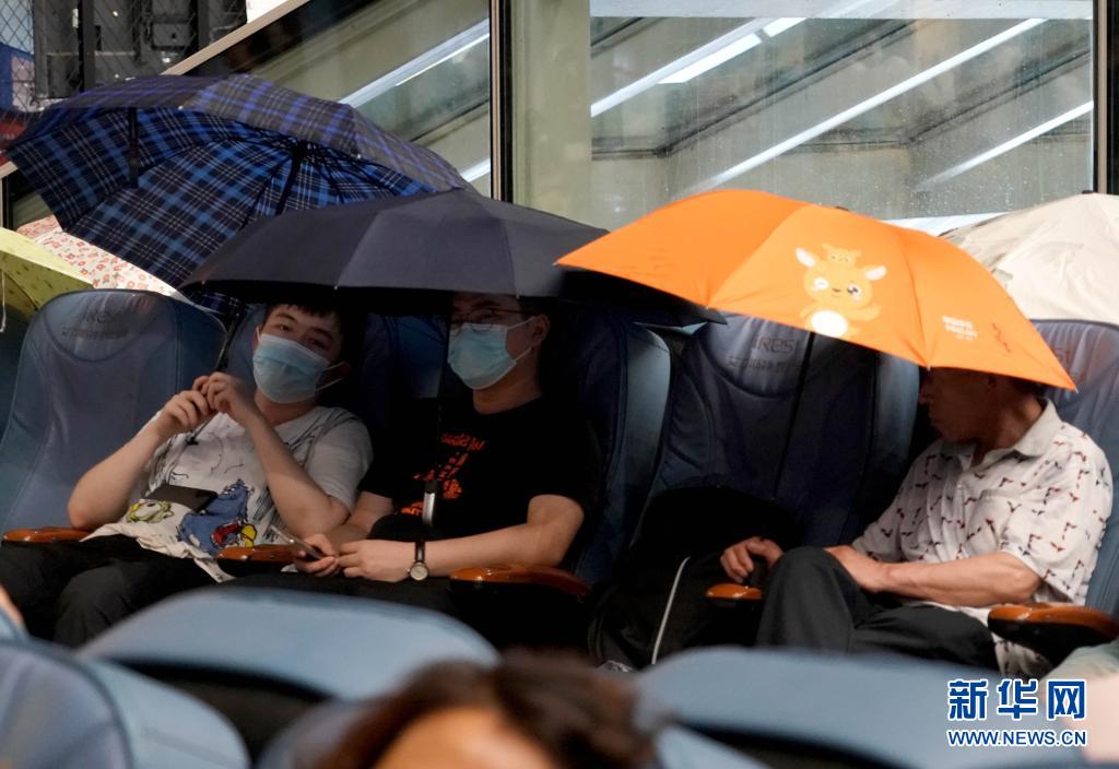 7月20日,旅客滯留在鄭州東站。候車廳出現(xiàn)漏雨情況,旅客撐傘擋雨。