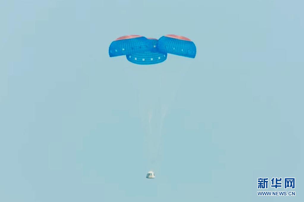 這張美國(guó)藍(lán)色起源公司7月20日發(fā)布的視頻截圖顯示“新謝潑德”飛行器在美國(guó)得克薩斯州西部降落。