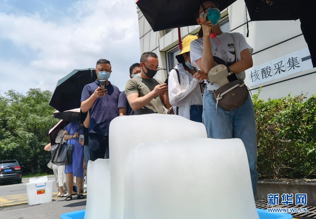 江蘇省南京市于7月21日開(kāi)始對(duì)全市常住人口、外來(lái)人員開(kāi)展全員核酸檢測(cè)。目前正值盛夏,氣溫較高,在南京市第一醫(yī)院河西院區(qū)核酸檢測(cè)點(diǎn),工作人員專(zhuān)門(mén)為排隊(duì)等候的市民準(zhǔn)備了冰塊降溫。