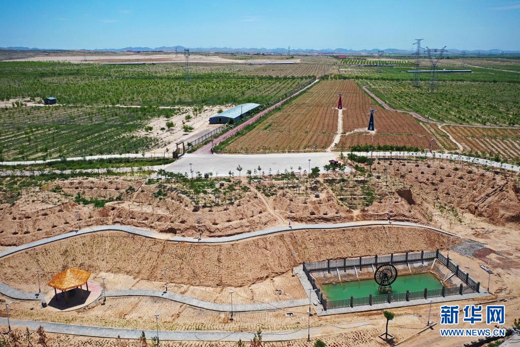 這是旱塬上的寧夏同心縣圣峰休閑生態(tài)觀光園(6月22日攝,無人機(jī)照片)。新華社記者 楊植森 攝