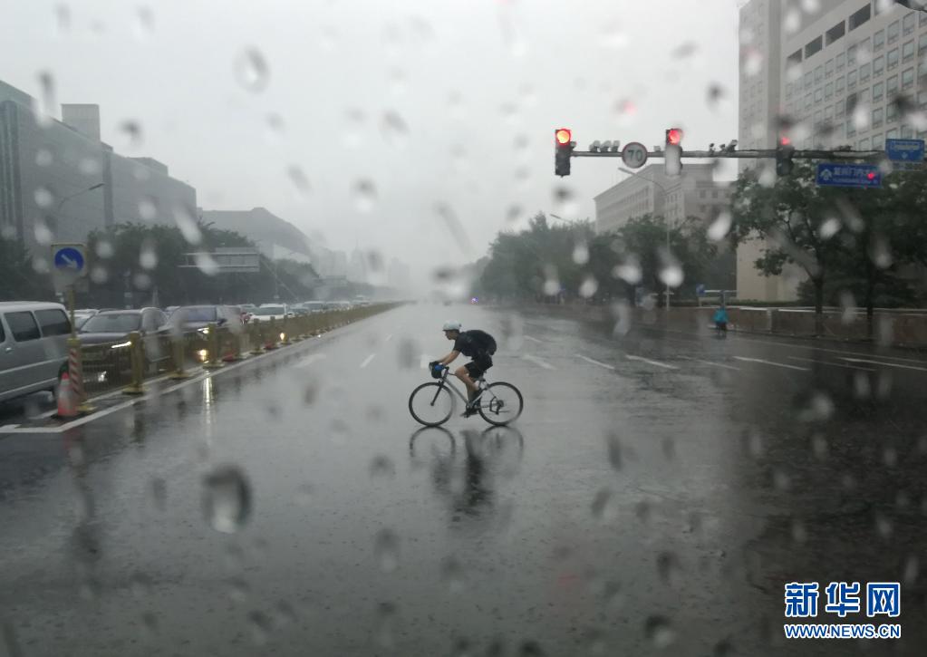 7月27日,騎行者冒雨經(jīng)過北京西單路口(手機(jī)拍攝)。