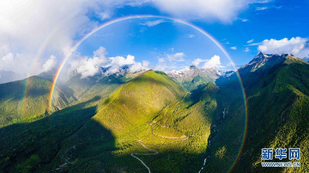 這是7月6日拍攝的米林縣派鎮(zhèn)至墨脫公路上的彩虹(無人機照片)。