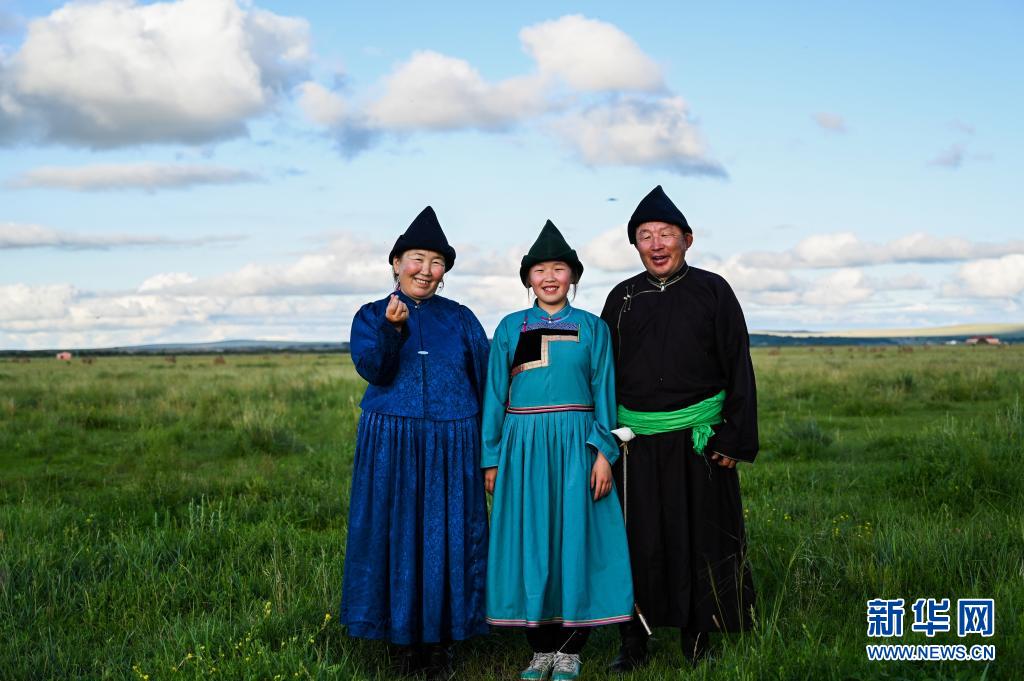 7月27日,吉布斯樂(lè)瑪(中)和父親嘎拉巴特爾(右)、母親其其格在草原上合影。