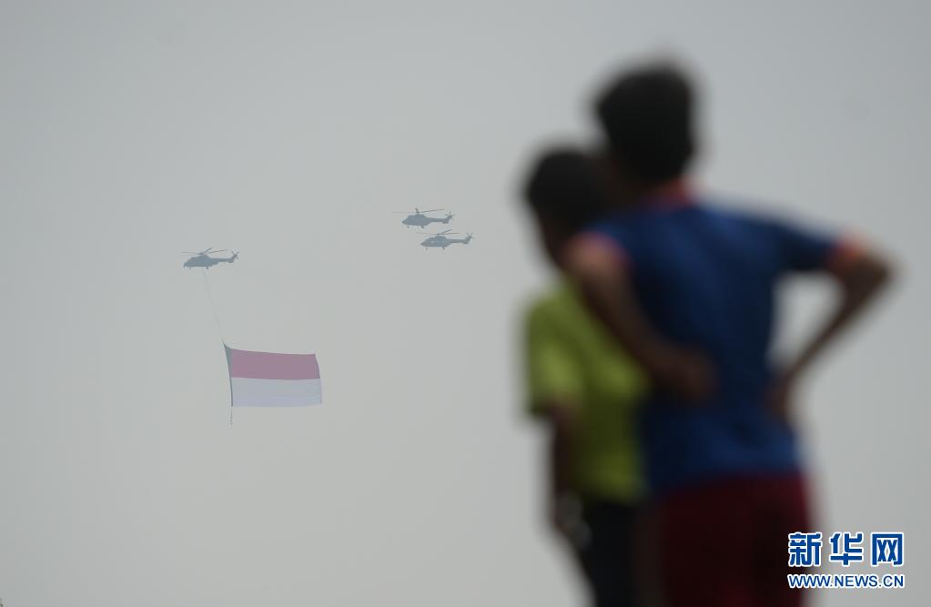 8月17日,人們注視著懸掛印度尼西亞國旗的直升機(jī)飛過雅加達(dá)上空。8月17日是印度尼西亞獨(dú)立日。新華社發(fā)(祖卡南攝)