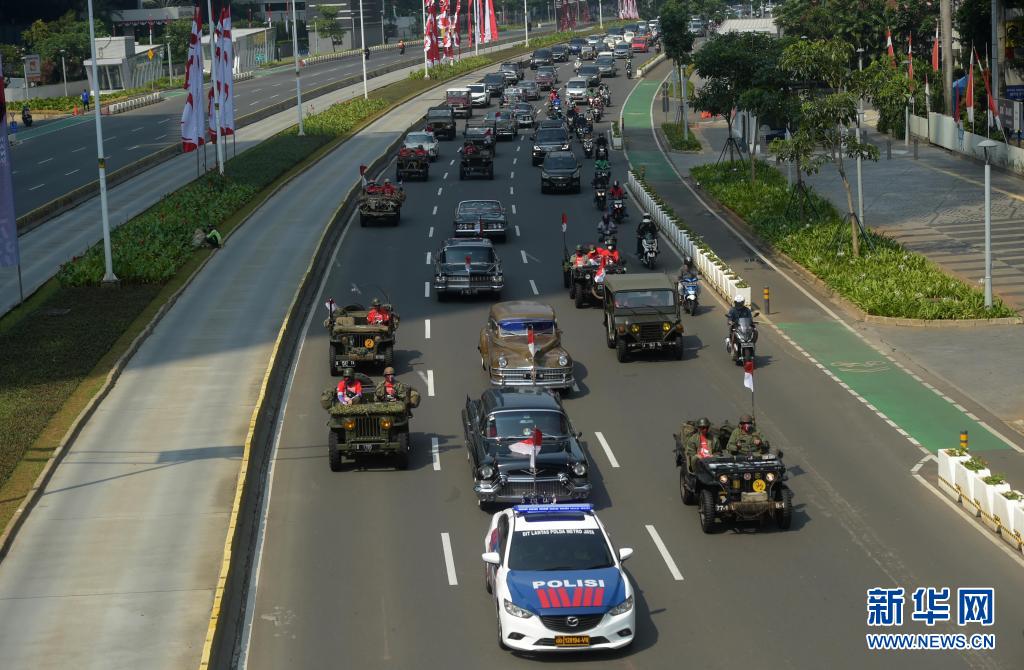 8月17日,參加印度尼西亞獨立日慶祝的車輛行駛在雅加達(dá)街頭。8月17日是印度尼西亞獨立日。新華社發(fā)(祖卡南攝)