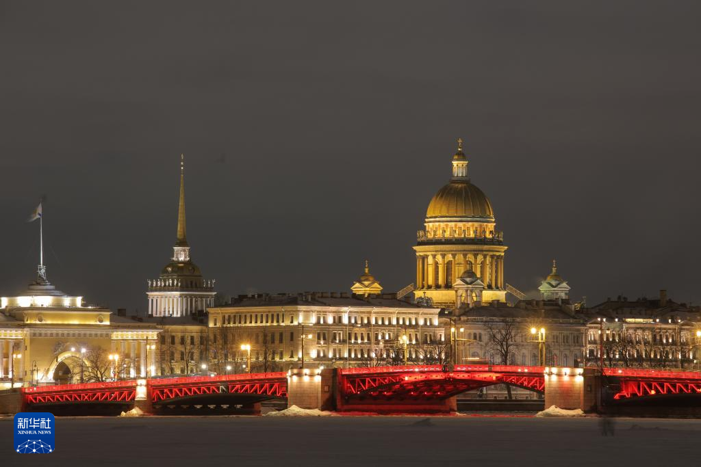2月15日晚,俄罗斯圣彼得堡冬宫桥亮起“中国红”,迎接马年春节。