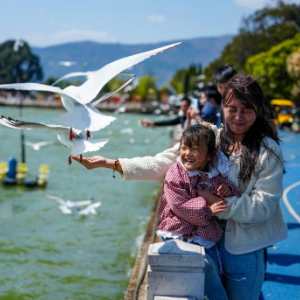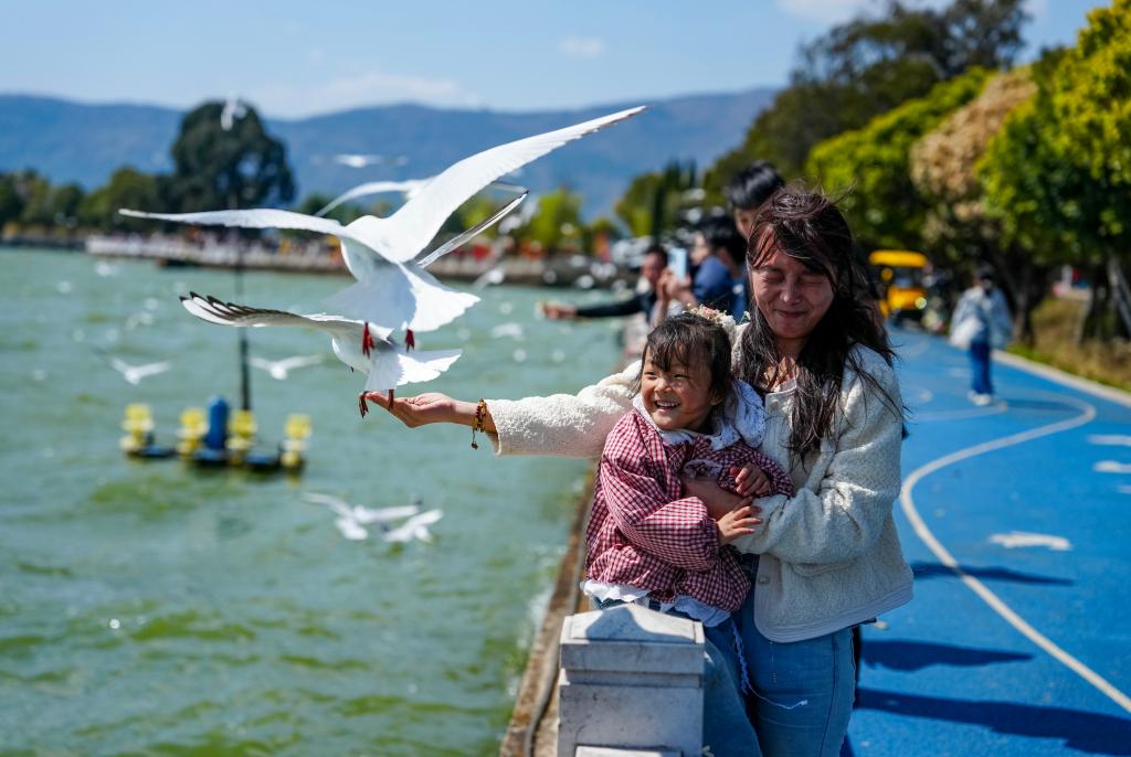 2月22日,在福保村内,游客在滇池边喂食红嘴鸥。