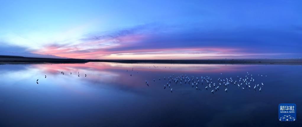 白鹭在甘肃省酒泉市阿克塞哈萨克族自治县冬不拉水库栖息觅食(2025年11月9日摄,无人机照片)。