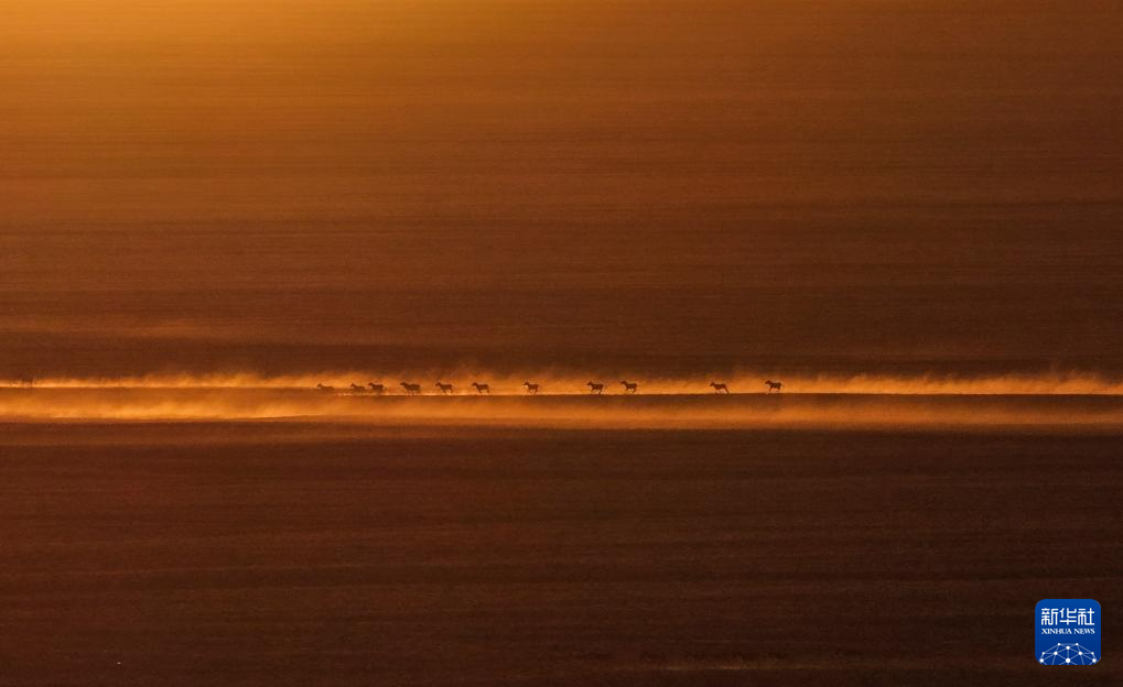 在新疆阿尔金山国家级自然保护区,藏野驴奔跑在日出时的依协克帕提草原上(2025年12月9日摄,无人机照片)。