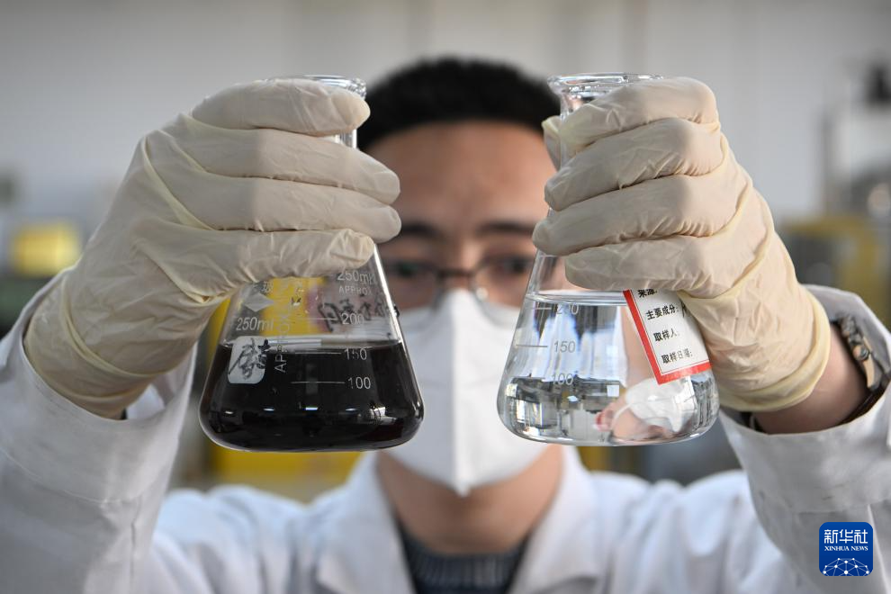 中海油天津化工研究设计院国家工业水处理工程技术研究中心的科研人员展示工业废水和经技术处理的循环水(2023年3月22日摄)。该中心主要在工业节水与废水资源化成套技术等领域进行科研攻关,成果广泛运用于石油开采、石油炼化、钢铁冶炼、煤化工等行业中,助力工业废水的资源化利用。