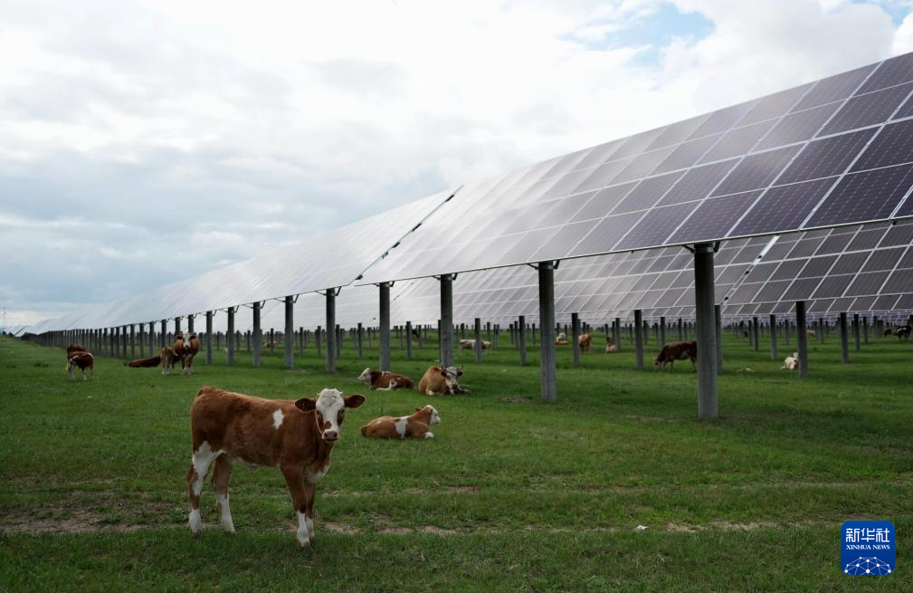 牛群在河北省围场满族蒙古族自治县御道口镇附近的一处“牧光互补”光伏发电场吃草(2024年7月25日摄)。