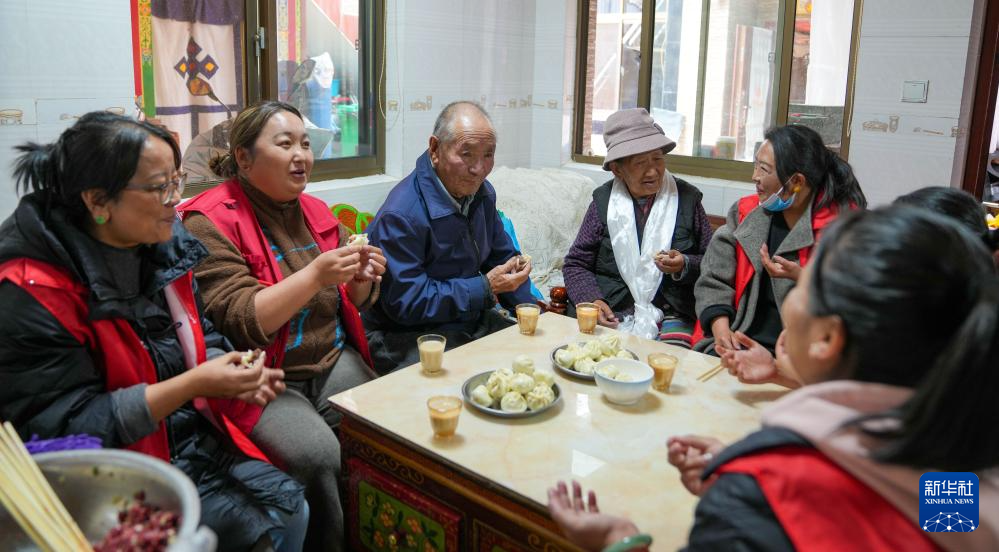 3月5日,拉萨纳金街道工作人员和辖区老人一起品尝包子。