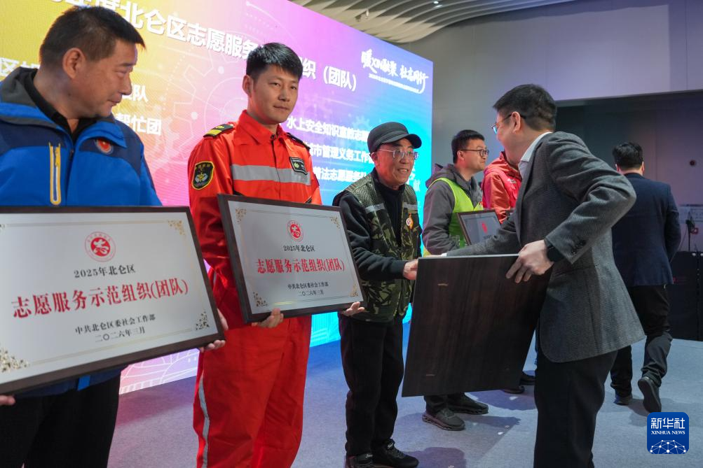 3月5日,志愿者代表在接受志愿服务示范组织表彰。