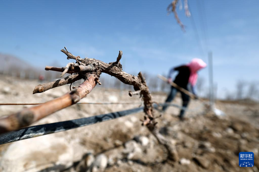 3月23日,工人在贺兰山东麓酿酒葡萄种植基地为葡萄展藤。