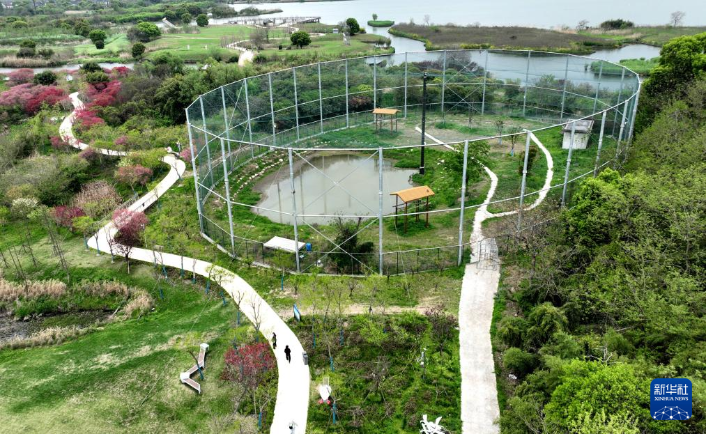 4月8日拍摄的浙江省湖州市德清县下渚湖朱鹮繁育研究基地(无人机照片)。