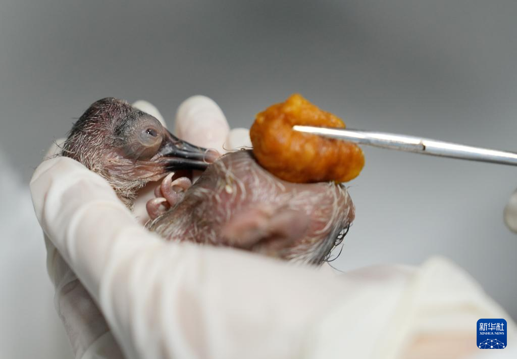4月8日,在浙江省湖州市德清县下渚湖朱鹮繁育研究基地,工作人员检查刚出壳的朱鹮幼鸟。
