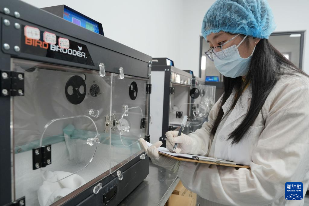 4月8日,在浙江省湖州市德清县下渚湖朱鹮繁育研究基地,工作人员检查朱鹮孵化情况。