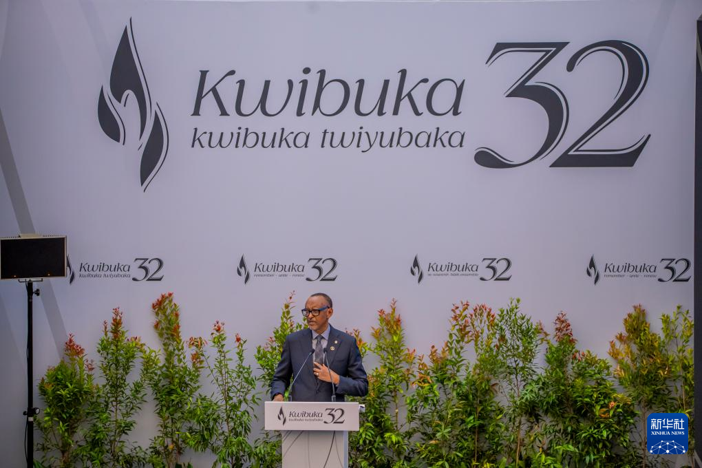 4月7日,在卢旺达基加利,卢旺达总统卡加梅在大屠杀32周年纪念活动启动仪式上发表主旨演讲。