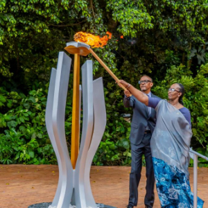 4月7日,在卢旺达基加利大屠杀纪念馆,卢旺达总统卡加梅及夫人珍妮特点燃纪念火炬。