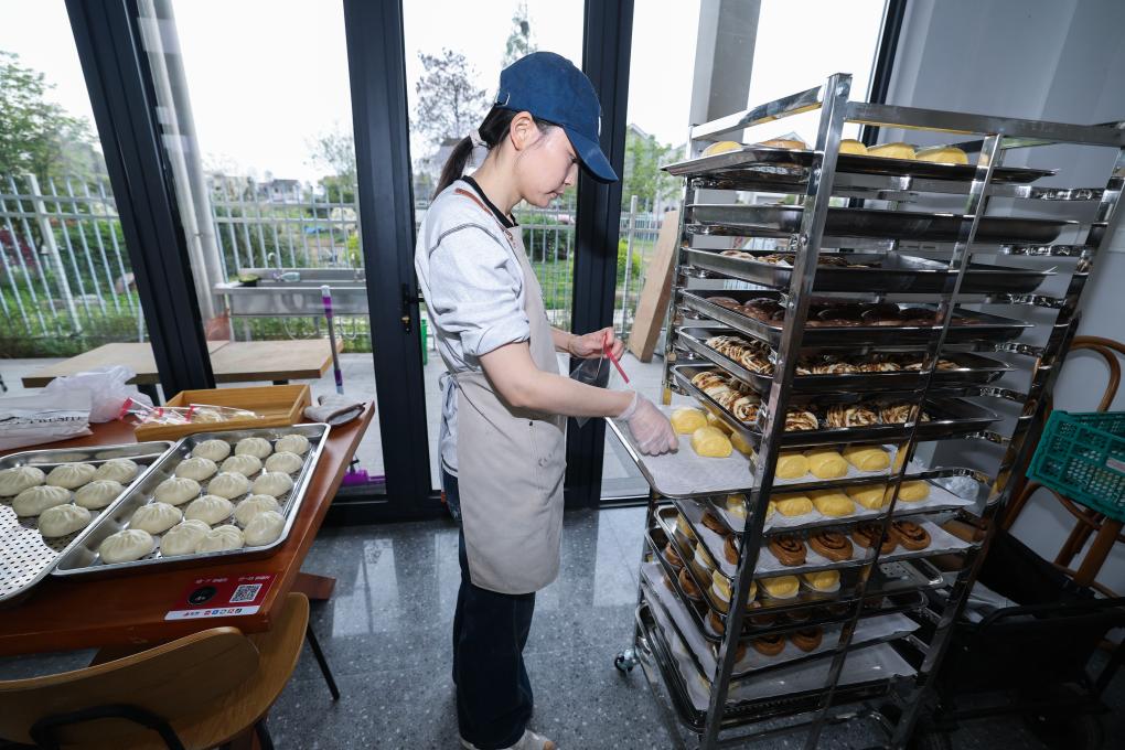 4月8日,在嘉兴市南湖区余新镇长秦村的“馒头酵主”创意馒头店内,店主沈峰在清点刚出炉的各式馒头。
