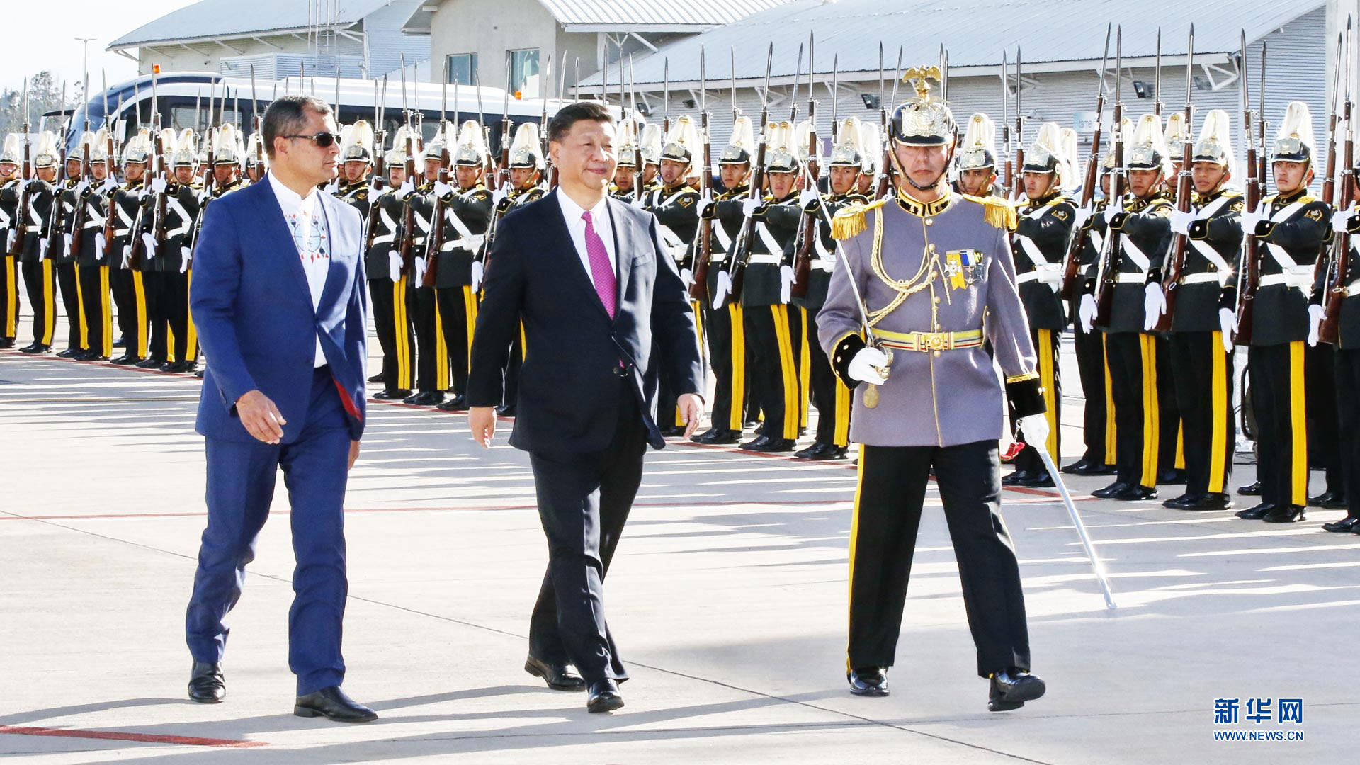 11月22日,國家主席習近平在圣地亞哥同智利總統(tǒng)巴切萊特舉行會談。這是會談前,習近平出席巴切萊特在憲法廣場舉行的隆重歡迎儀式。新華社記者 王曄 攝2016-11-23