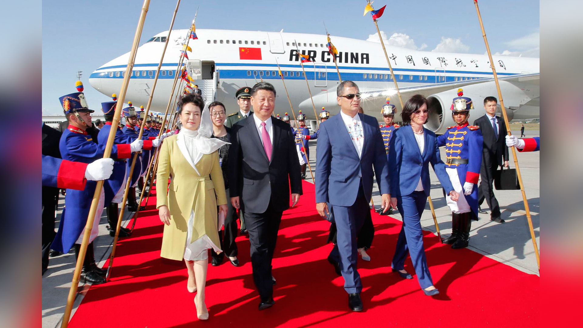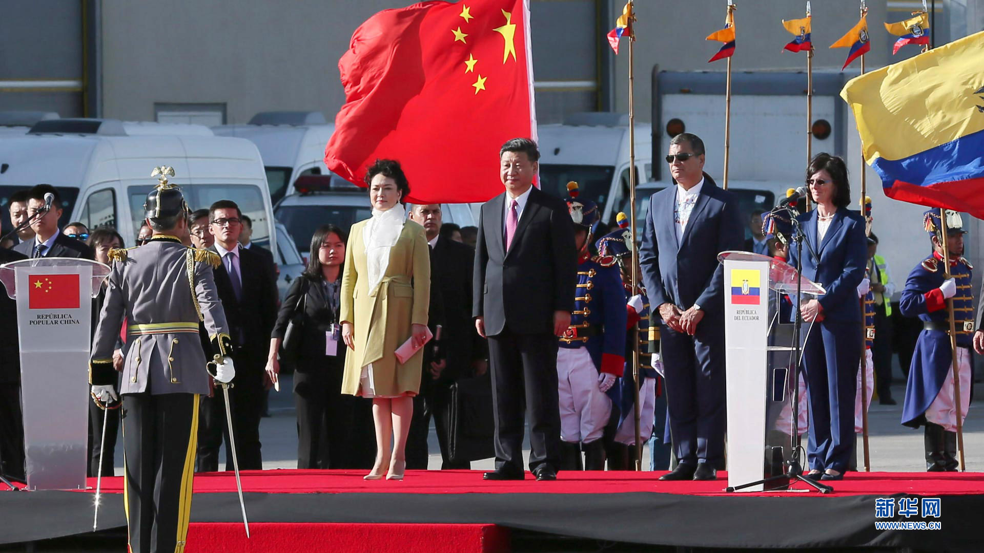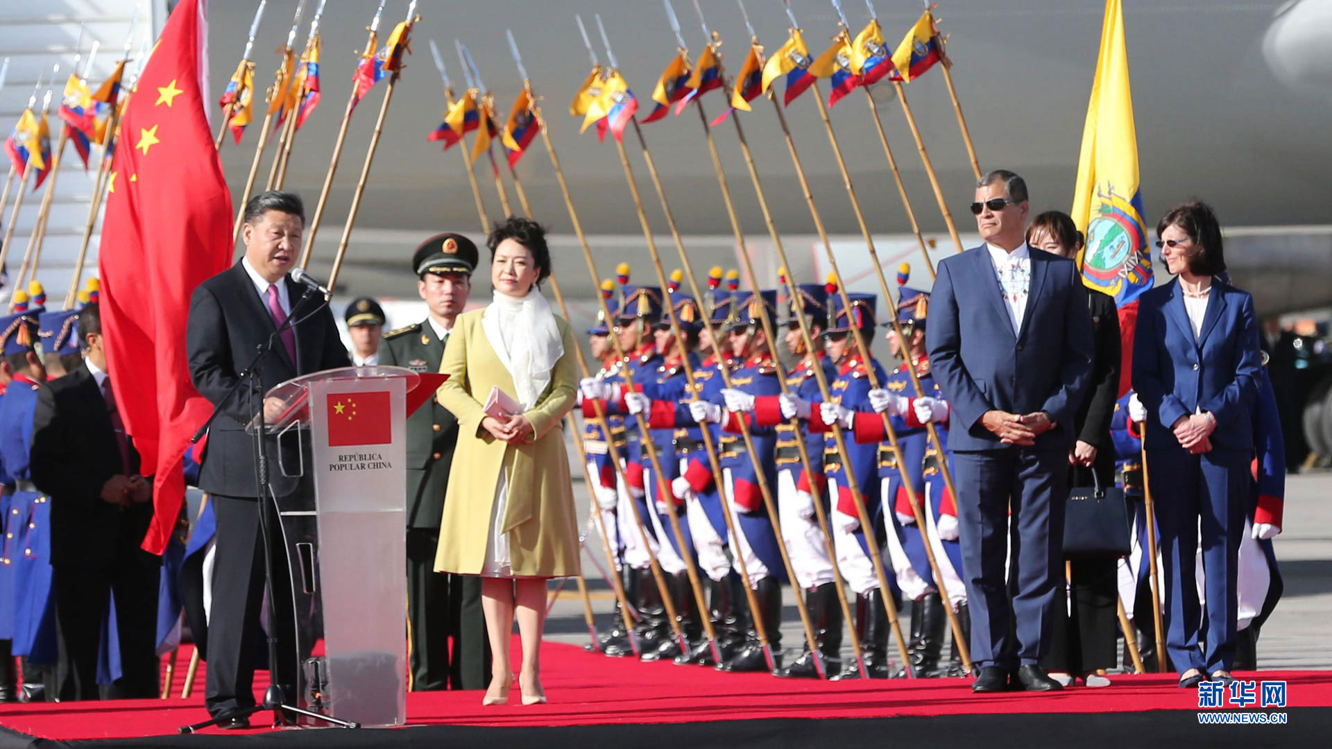 當?shù)貢r間11月17日,國家主席習近平乘專機抵達基多,開始對厄瓜多爾共和國進行國事訪問。厄瓜多爾總統(tǒng)科雷亞和夫人馬勒布等在機場熱情迎接習近平和夫人彭麗媛。新華社記者 鞠鵬 攝2016-11-18