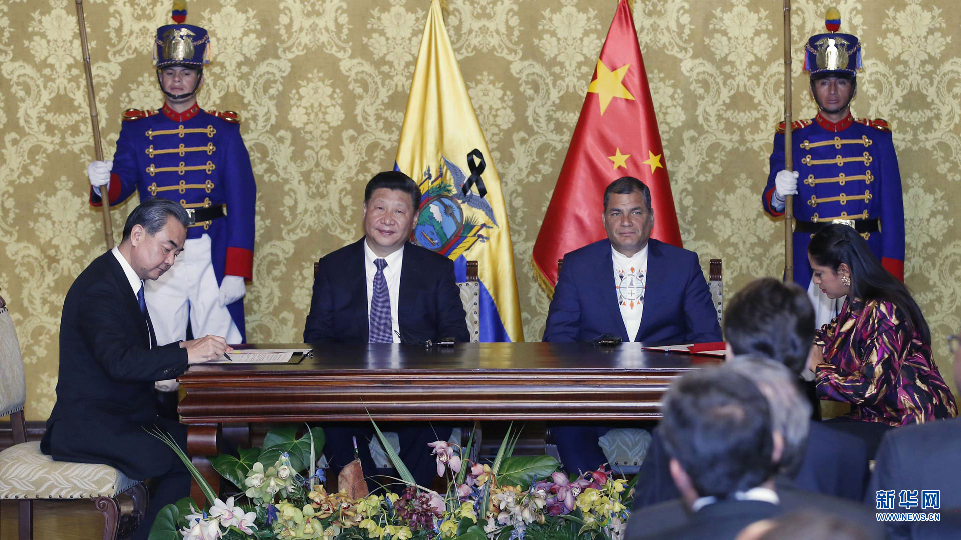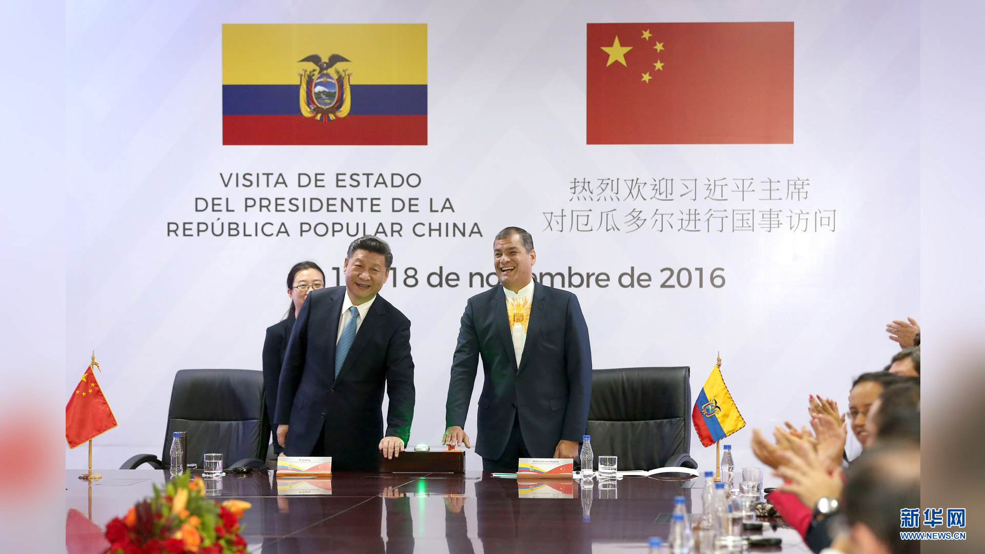 當?shù)貢r間11月17日,國家主席習近平在基多同厄瓜多爾總統(tǒng)科雷亞舉行會談。這是會談后,兩國元首見證雙邊合作文件的簽署。 新華社記者 鞠鵬攝2016-11-18