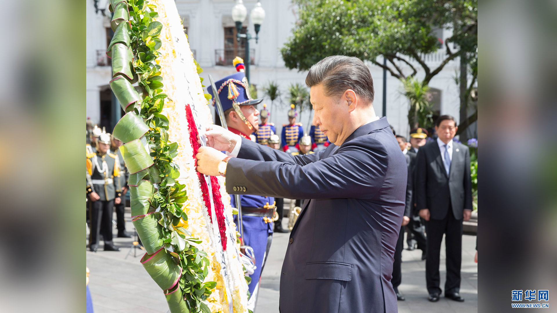 當?shù)貢r間11月18日,國家主席習近平向厄瓜多爾獨立英雄紀念碑敬獻花圈。 新華社記者 黃敬文 攝2016-11-19