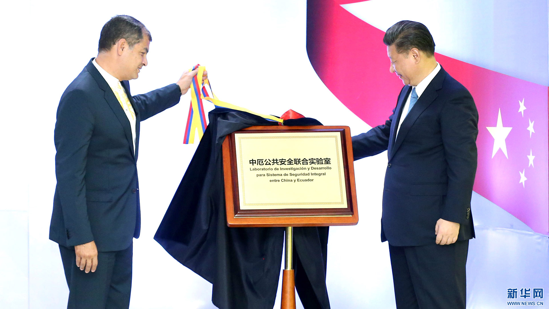 當?shù)貢r間11月18日,國家主席習近平在基多同厄瓜多爾總統(tǒng)科雷亞共同出席中方援建的厄瓜多爾公共安全應(yīng)急指揮中心聯(lián)合實驗室揭牌儀式,喬內(nèi)醫(yī)院奠基、科卡科多-辛克雷水電站竣工發(fā)電視頻連線活動。這是兩國元首共同為厄瓜多爾公共安全應(yīng)急指揮中心聯(lián)合實驗室揭牌。新華社記者 馬占成 攝2016-11-19