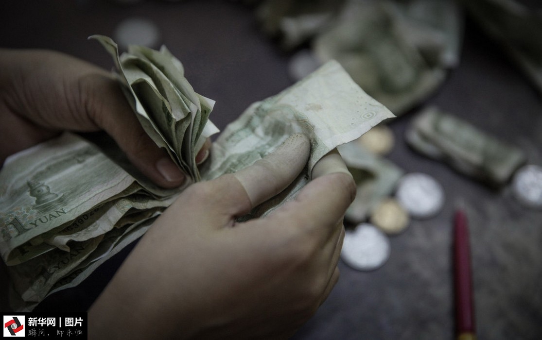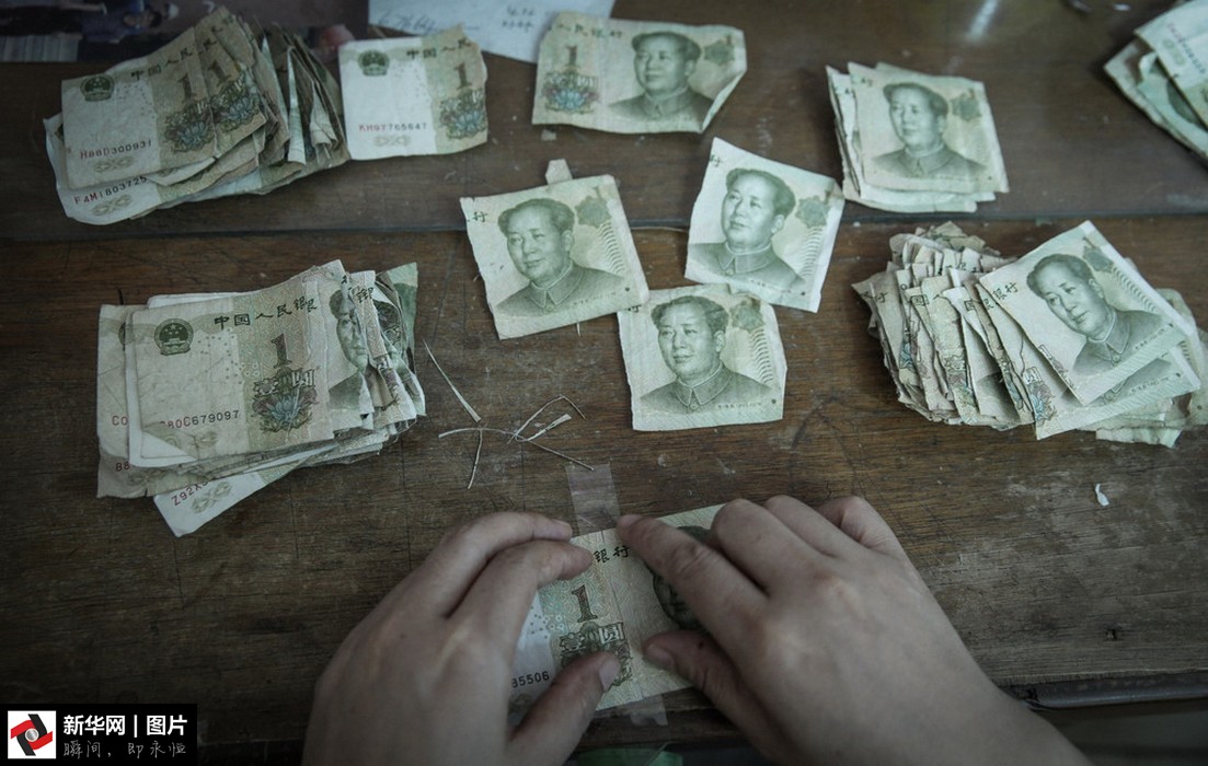 點(diǎn)鈔中心的員工在修補(bǔ)殘破的人民幣。