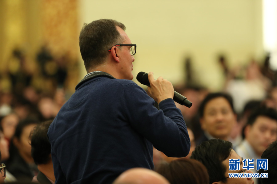 2017年10月17日下午,中國共產(chǎn)黨第十九次全國代表大會(huì)新聞發(fā)言人在人民大會(huì)堂三樓金色大廳舉行新聞發(fā)布會(huì),并回答中外記者提問。圖為埃菲社記者提問。新華網(wǎng) 翟子赫 攝