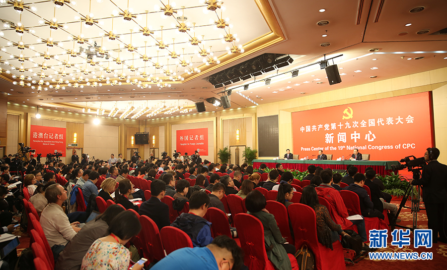 ??? 10月19日,十九大新聞中心舉行記者會,邀請中紀(jì)委、中組部負(fù)責(zé)人介紹黨的建設(shè)和全面從嚴(yán)治黨相關(guān)情況。圖為記者會現(xiàn)場。新華網(wǎng) 郝廣鵬攝