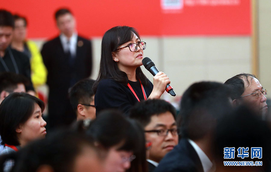 ??? 10月20日,十九大新聞中心舉辦集體采訪活動,主題為“文化發(fā)展開創(chuàng)新局面”。圖為中央人民廣播電臺記者提問。新華網(wǎng) 陳杰攝