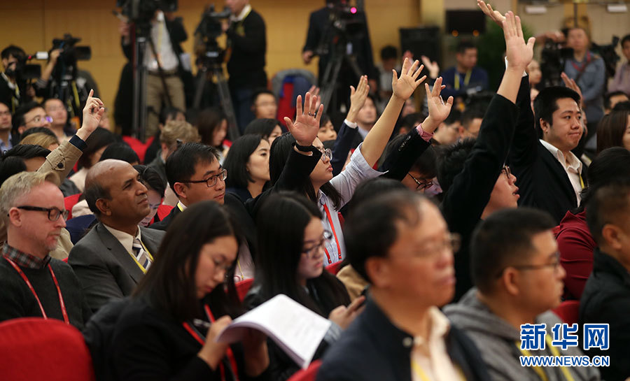 10月21日,十九大新聞中心舉辦記者招待會(huì),邀請(qǐng)中共中央統(tǒng)戰(zhàn)部常務(wù)副部長(zhǎng)張裔炯、副部長(zhǎng)冉萬祥,中共中央對(duì)外聯(lián)絡(luò)部副部長(zhǎng)郭業(yè)洲介紹黨的統(tǒng)一戰(zhàn)線工作和黨的對(duì)外交往情況,并回答記者提問。圖為現(xiàn)場(chǎng)記者。新華網(wǎng) 郝廣鵬攝