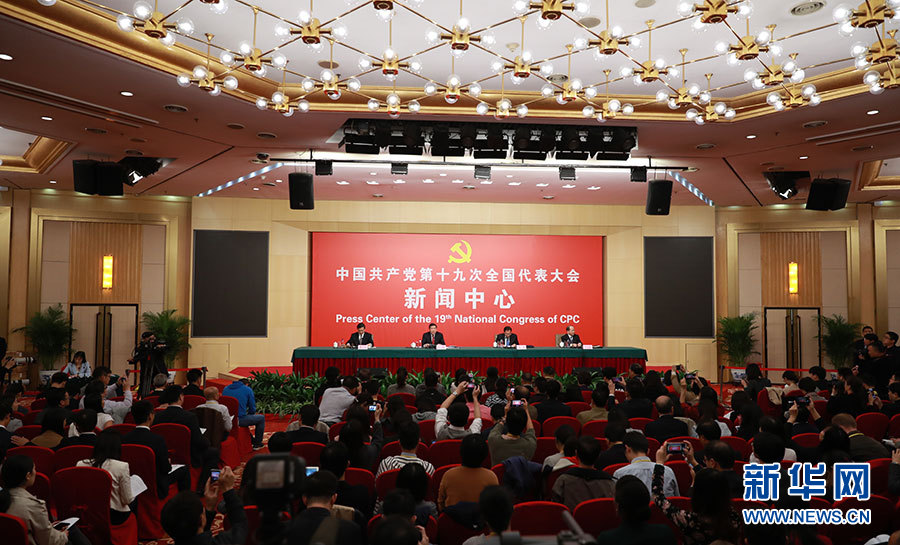 ??? 10月21日,十九大新聞中心舉辦記者招待會(huì),邀請(qǐng)國(guó)家發(fā)展改革委黨組書(shū)記、主任何立峰,副主任張勇,副主任寧吉喆介紹以新發(fā)展理念為引領(lǐng),推進(jìn)中國(guó)經(jīng)濟(jì)平穩(wěn)健康可持續(xù)發(fā)展有關(guān)情況,并回答記者提問(wèn)。圖為記者招待會(huì)現(xiàn)場(chǎng)。新華網(wǎng) 郝廣鵬攝