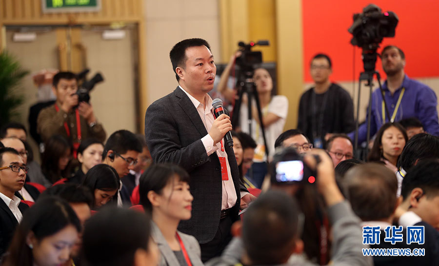 10月21日,十九大新聞中心舉辦記者招待會(huì),邀請(qǐng)國(guó)家發(fā)展改革委黨組書記、主任何立峰,副主任張勇,副主任寧吉喆介紹以新發(fā)展理念為引領(lǐng),推進(jìn)中國(guó)經(jīng)濟(jì)平穩(wěn)健康可持續(xù)發(fā)展有關(guān)情況,并回答記者提問。圖為人民鐵道報(bào)記者提問。新華網(wǎng) 郝廣鵬攝