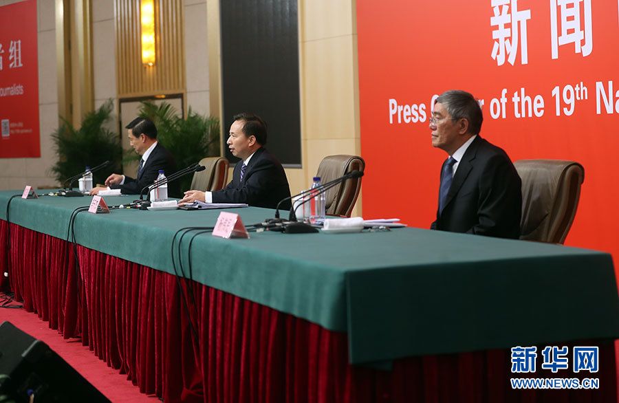 10月23日,十九大新聞中心舉辦記者招待會,邀請中央財經(jīng)領(lǐng)導(dǎo)小組辦公室副主任楊偉民,環(huán)境保護(hù)部黨組書記、部長李干杰介紹踐行綠色發(fā)展理念,建設(shè)美麗中國有關(guān)情況,并回答記者提問。圖為記者招待會現(xiàn)場。新華網(wǎng) 郝廣鵬攝
