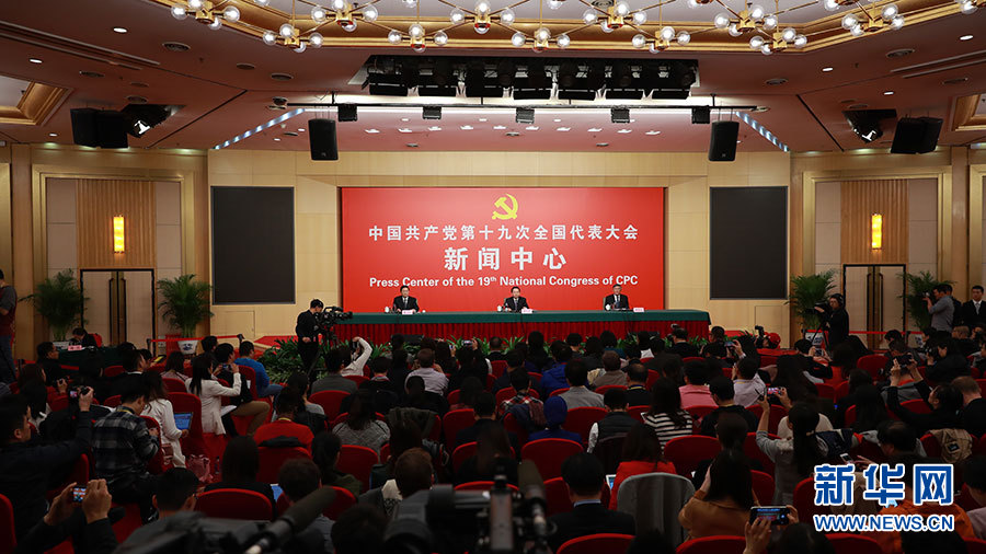 10月23日,十九大新聞中心舉辦記者招待會(huì),邀請(qǐng)中央財(cái)經(jīng)領(lǐng)導(dǎo)小組辦公室副主任楊偉民,環(huán)境保護(hù)部黨組書(shū)記、部長(zhǎng)李干杰介紹踐行綠色發(fā)展理念,建設(shè)美麗中國(guó)有關(guān)情況,并回答記者提問(wèn)。圖為記者招待會(huì)現(xiàn)場(chǎng)。新華網(wǎng) 郝廣鵬攝