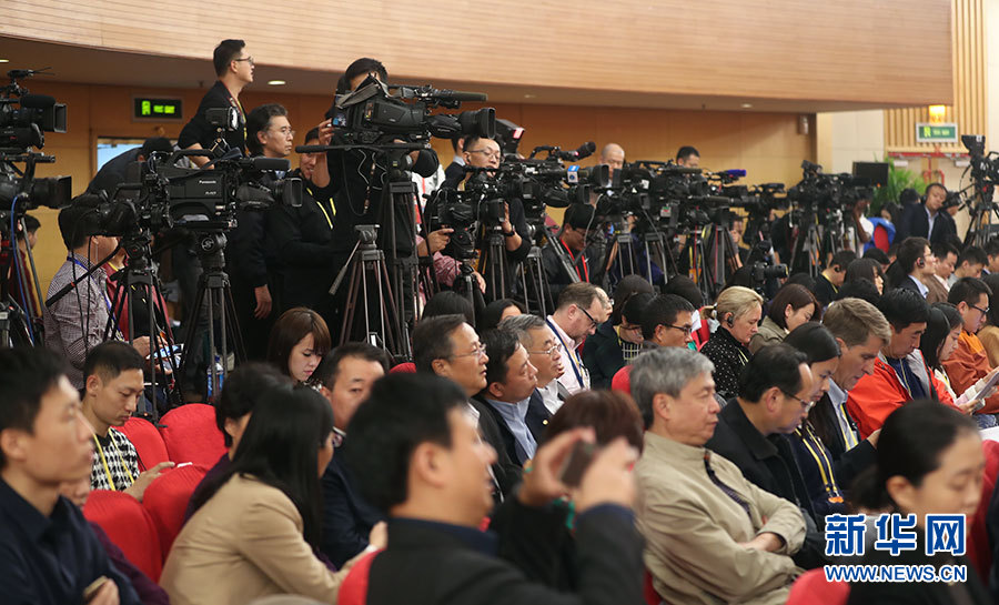 10月23日,十九大新聞中心舉辦記者招待會,邀請中央財經(jīng)領導小組辦公室副主任楊偉民,環(huán)境保護部黨組書記、部長李干杰介紹踐行綠色發(fā)展理念,建設美麗中國有關情況,并回答記者提問。圖為現(xiàn)場記者。新華網(wǎng) 郝廣鵬攝