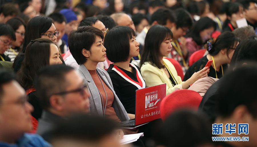 10月23日,十九大新聞中心舉辦記者招待會(huì),邀請(qǐng)中央財(cái)經(jīng)領(lǐng)導(dǎo)小組辦公室副主任楊偉民,環(huán)境保護(hù)部黨組書記、部長(zhǎng)李干杰介紹踐行綠色發(fā)展理念,建設(shè)美麗中國(guó)有關(guān)情況,并回答記者提問。圖為現(xiàn)場(chǎng)記者。新華網(wǎng) 郝廣鵬攝