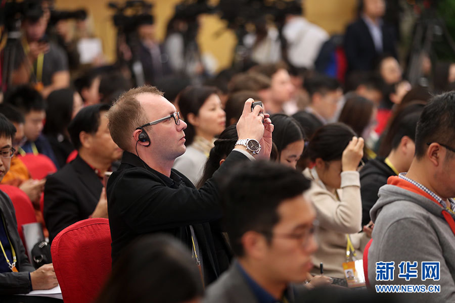 10月23日,十九大新聞中心舉辦記者招待會,邀請中央財(cái)經(jīng)領(lǐng)導(dǎo)小組辦公室副主任楊偉民,環(huán)境保護(hù)部黨組書記、部長李干杰介紹踐行綠色發(fā)展理念,建設(shè)美麗中國有關(guān)情況,并回答記者提問。圖為現(xiàn)場記者。新華網(wǎng) 郝廣鵬攝