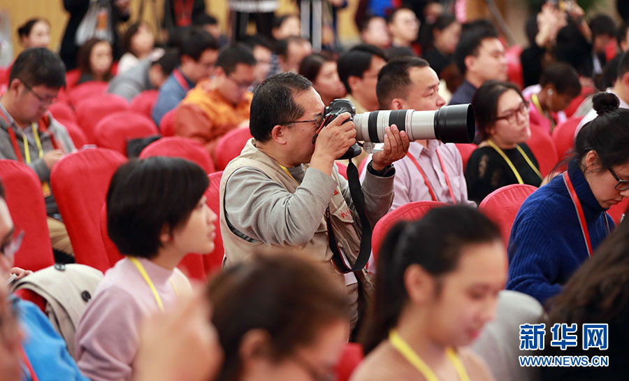 10月23日,十九大新聞中心舉辦集體采訪活動(dòng),主題為“打好生態(tài)環(huán)保攻堅(jiān)戰(zhàn)”。圖為現(xiàn)場記者。新華網(wǎng) 郝廣鵬攝
