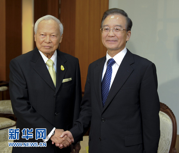 ??? 11月21日,國務院總理溫家寶在曼谷會見泰國樞密院主席炳·廷素拉暖上將。 新華社記者 張鐸 攝