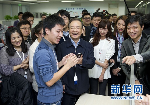 ??? 12月13日,國務院總理溫家寶到北京中關村考察并與部分企業(yè)負責人座談。這是溫家寶在百度公司考察時,試用手機語音搜索。 新華社記者黃敬文 攝