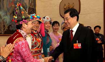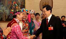 胡錦濤等黨和國家領導人走進會場,來到身著民族盛裝的少數(shù)民族代表、委員們中間,同大家親切握手,互致問候。