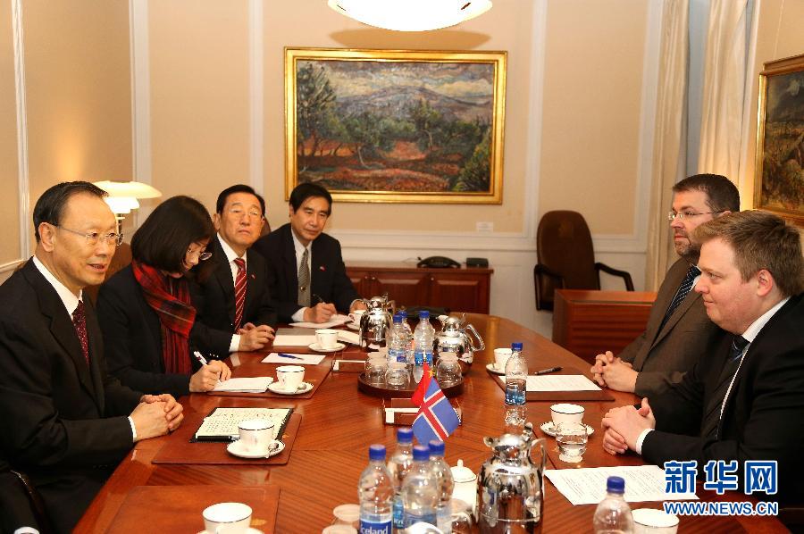 ??? 11月14日,在冰島首都雷克雅未克,中央書記處書記、全國政協(xié)副主席杜青林(左一)與冰島總理京勒伊格松(右一)舉行會談。新華社記者黃曉南攝