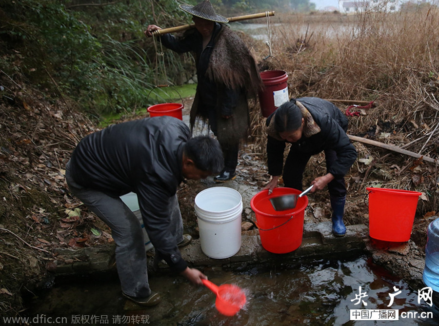 2014年12月9日?qǐng)?bào)道,由于飲用水水庫(kù)緊挨著露天垃圾填埋場(chǎng),生怕水質(zhì)不佳而影響自己的身體健康,義烏市佛堂鎮(zhèn)陳村的不少村民們?cè)僖膊桓覐拇孱^的團(tuán)結(jié)水庫(kù)取水飲用了,眼下590多名村民為了飲水安全問(wèn)題而糾結(jié)不堪。陳村的村民冒雨前往村外一處的泉眼取水。 圖片署名:浙報(bào)集團(tuán)-東方IC