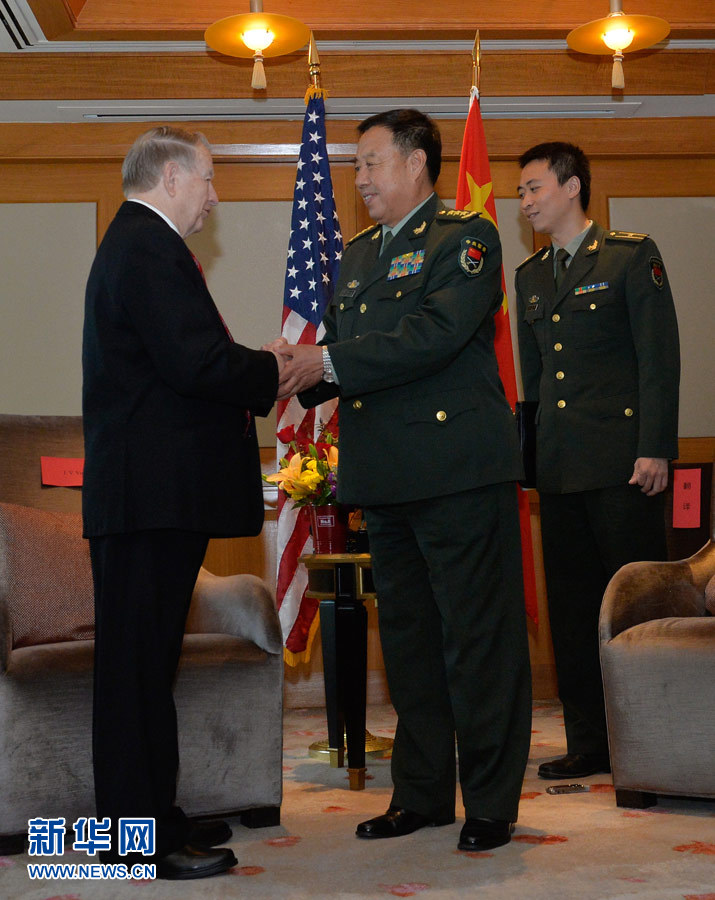 ??? 6月12日,正在美國(guó)訪問(wèn)的中央軍委副主席范長(zhǎng)龍(中)在華盛頓接見(jiàn)飛虎隊(duì)老兵杰·溫雅德。 新華社記者鮑丹丹攝