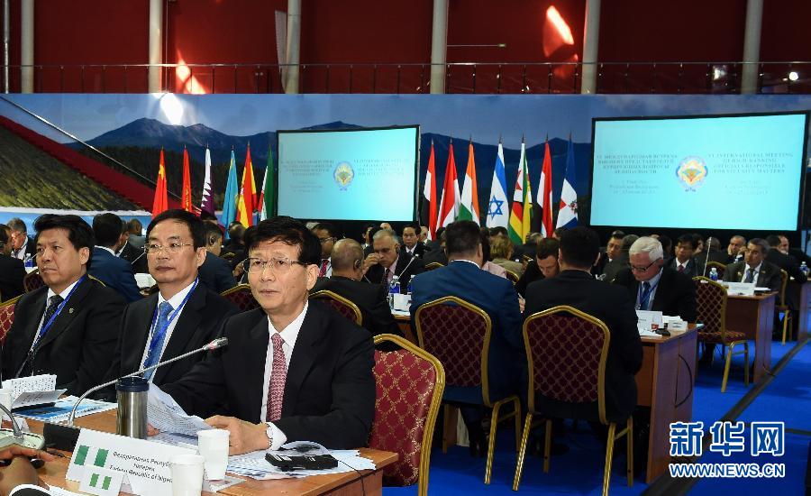 ??? 6月25日,中共中央政治局委員、中央政法委書記孟建柱(前右)出席在俄羅斯烏蘭烏德舉行的第六屆安全事務(wù)高級代表國際會議。中共中央政治局委員、中央政法委書記孟建柱24日至25日出席在俄羅斯烏蘭烏德舉行的第六屆安全事務(wù)高級代表國際會議。來自近70個國家和國際組織的代表圍繞加強國際協(xié)作,共同打擊極端勢力和恐怖主義進(jìn)行深入討論,達(dá)成重要共識。新華社記者賈宇辰攝